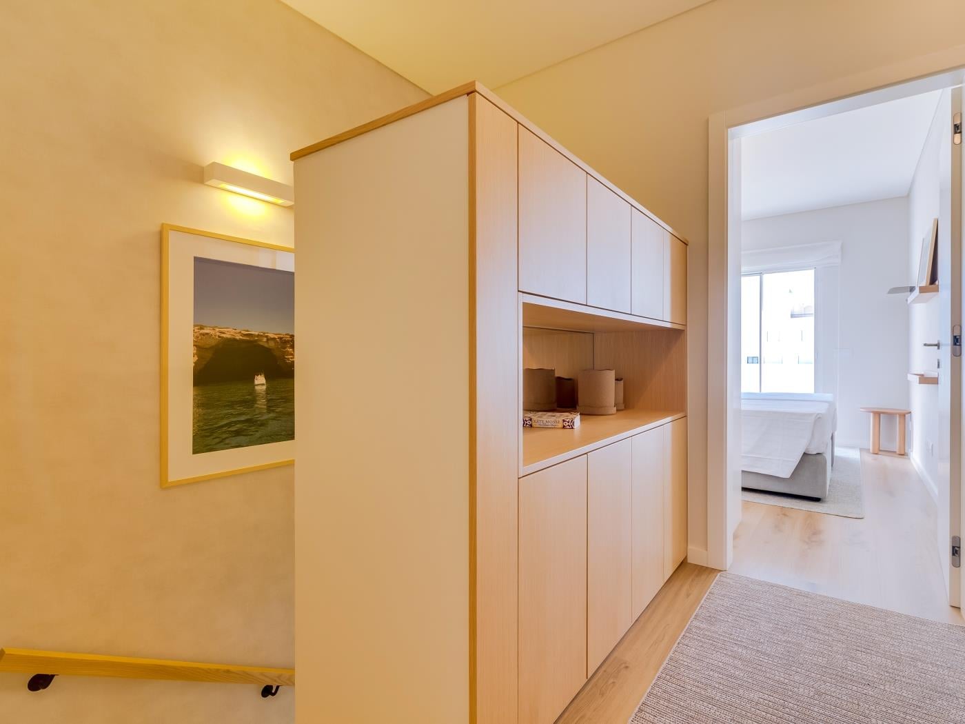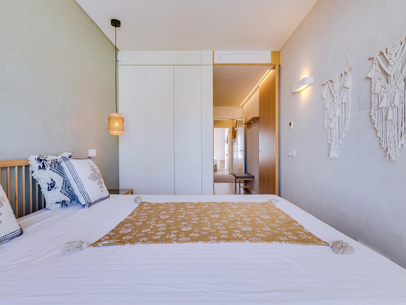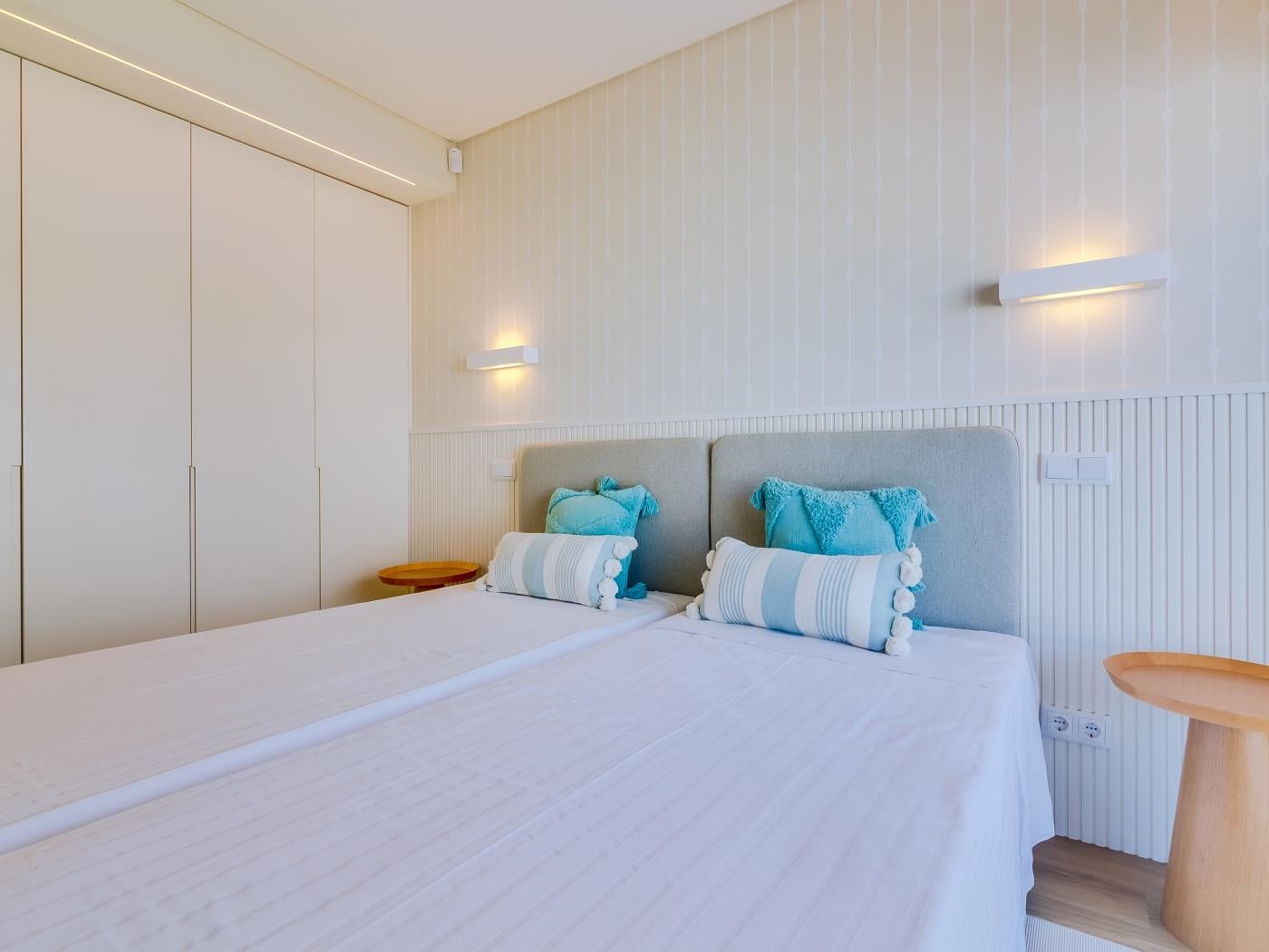 No rés do chão encontra dois quartos acolhedores e uma casa de banho completa. No piso superior, há mais dois quartos, sendo um deles suíte com casa de banho privativa. Os dois quartos com camas individuais têm varanda própria, equipada com mobiliário exterior — perfeitas para relaxar com privacidade.