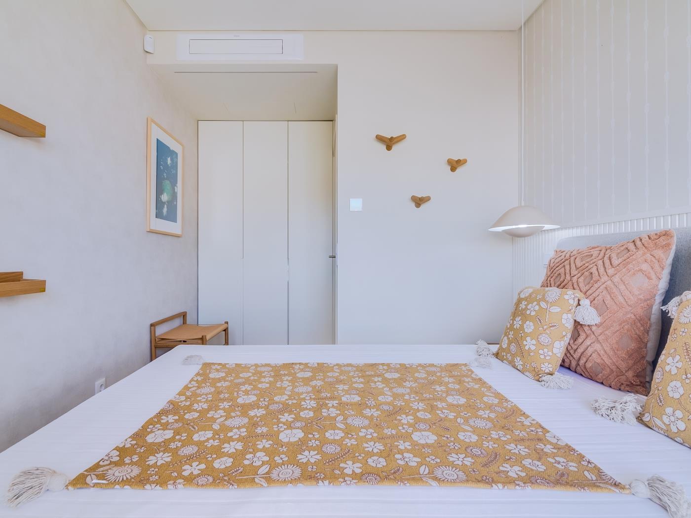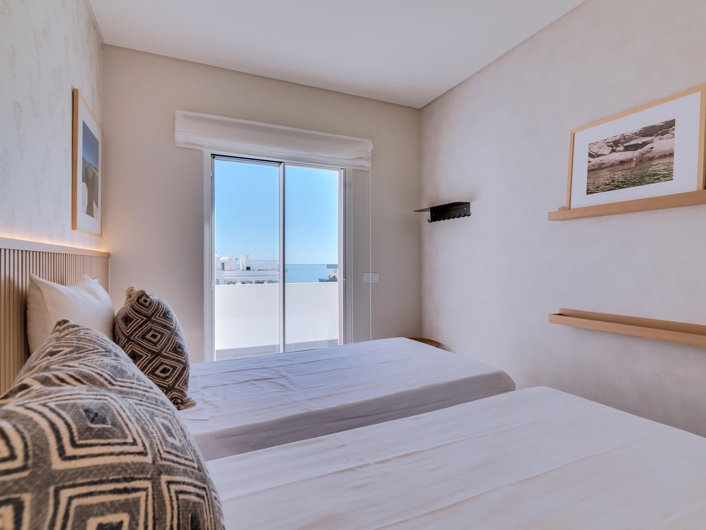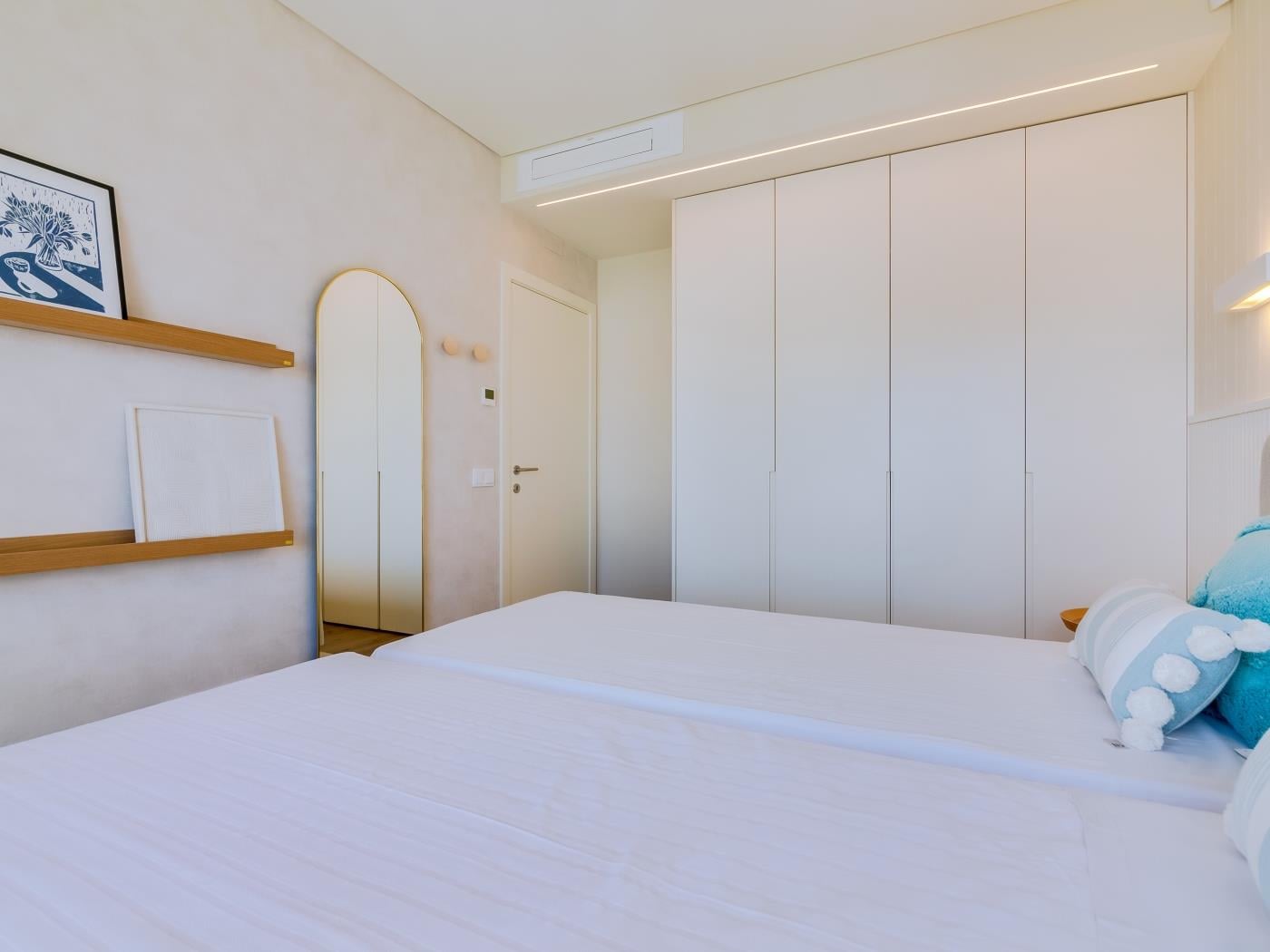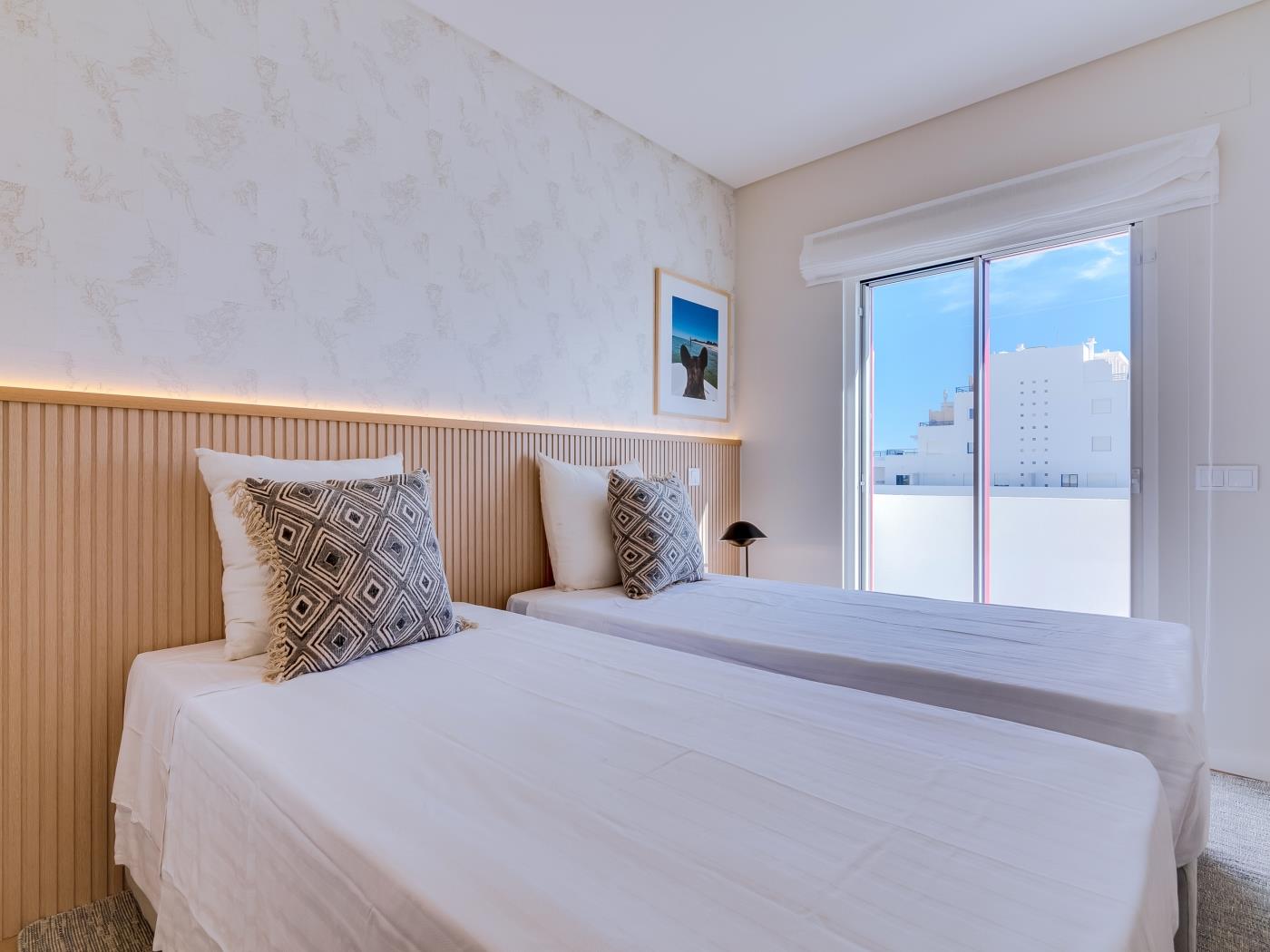 No rés do chão encontra dois quartos acolhedores e uma casa de banho completa. No piso superior, há mais dois quartos, sendo um deles suíte com casa de banho privativa. Os dois quartos com camas individuais têm varanda própria, equipada com mobiliário exterior — perfeitas para relaxar com privacidade.