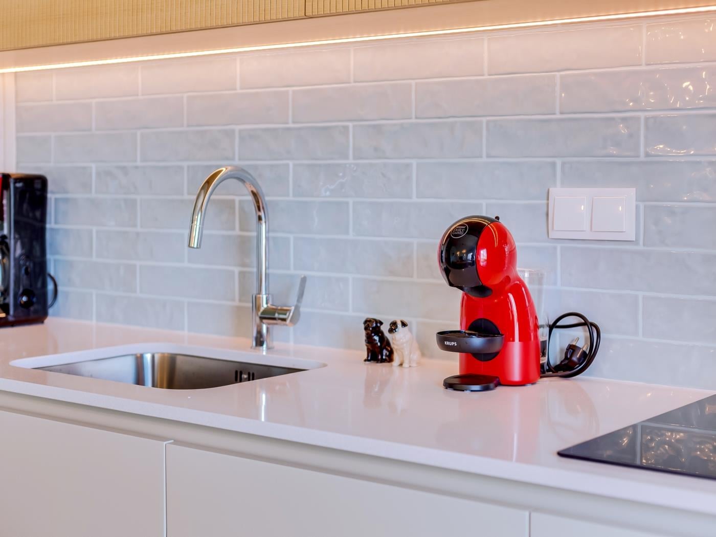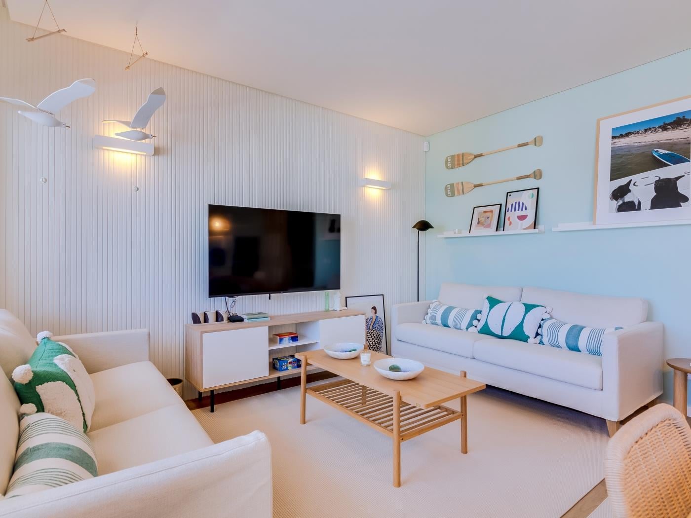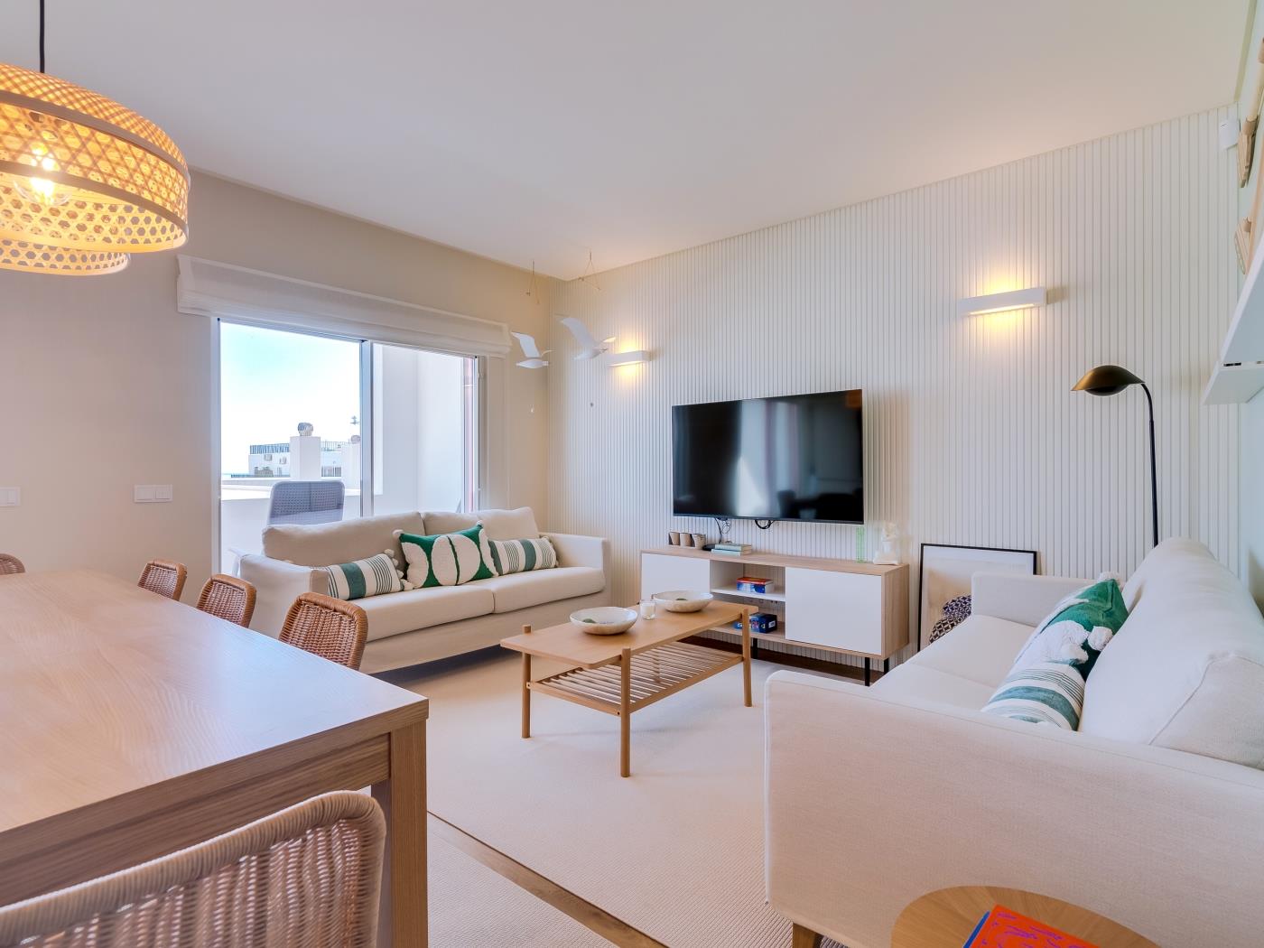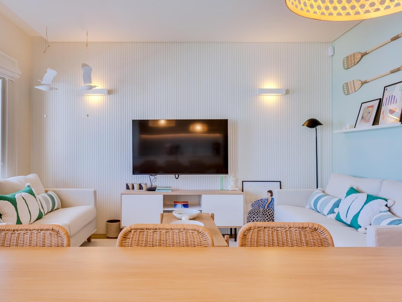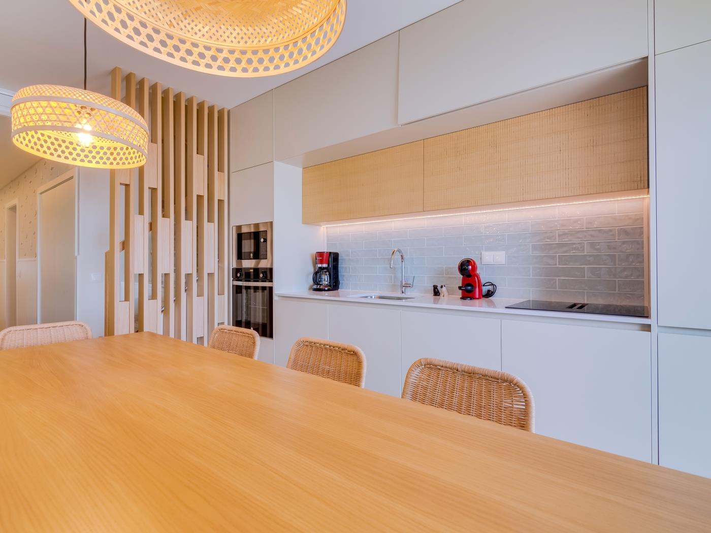A sala, em open space com a cozinha, é ampla e luminosa. A cozinha está totalmente equipada e dispõe de uma mesa de refeições confortável para todos os hóspedes. A varanda da sala convida a momentos descontraídos, com sofá e cadeiras ideais para desfrutar do ar livre.